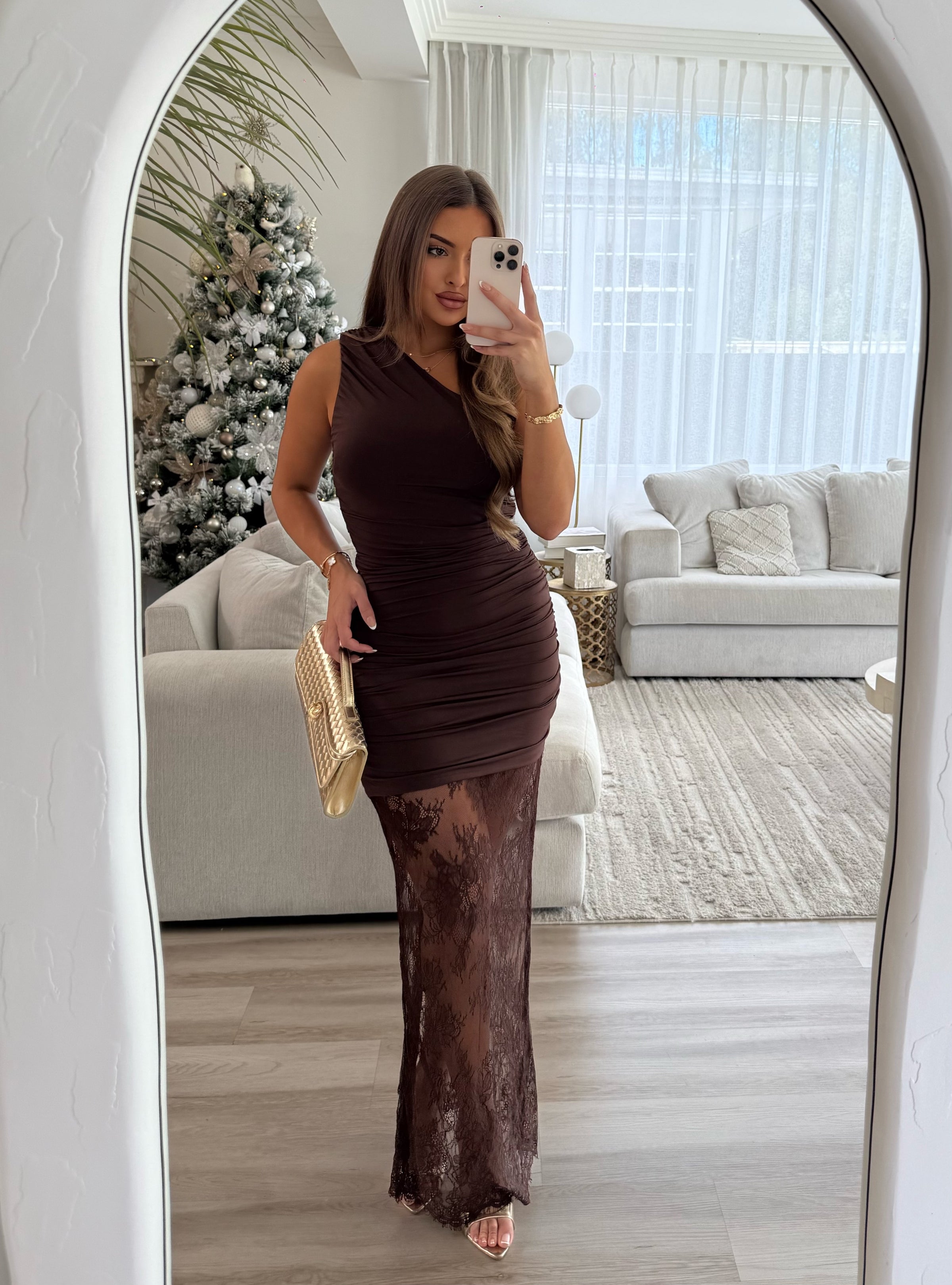 The Stephanie Dress is a stunning statement piece, designed to embody both elegance and romance. Featuring a one-shoulder neckline with a beautifully ruched bodice, this dress flatters the figure while adding a touch of modern sophistication. A delicate lace underlay flows gracefully to the floor, contrasting with the fitted mini-dress silhouette to create depth, definition, and drama. The Stephanie Dress is the perfect choice for evening wear, exuding timeless glamour with every step.