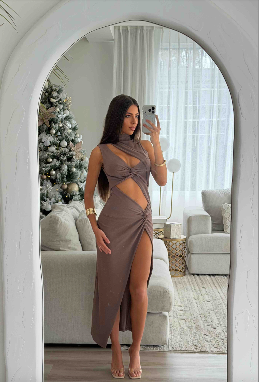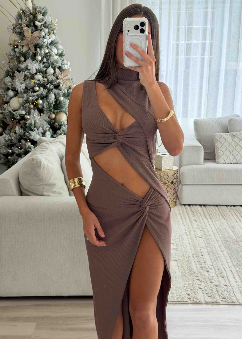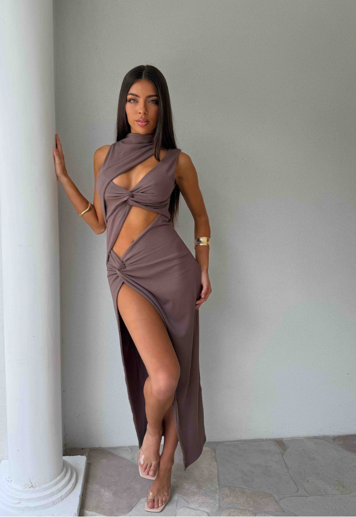 Our Zalia Dress in mocha is your next IT-girl statement, bringing confidence and sexiness to a whole new level. If you’re looking for a standout birthday dress, this is it. Crafted from our double-lined stretch ribbed fabric, it features flattering cut-out details throughout, a sleek high-neck design, and a bold high split on one leg to finish the look.