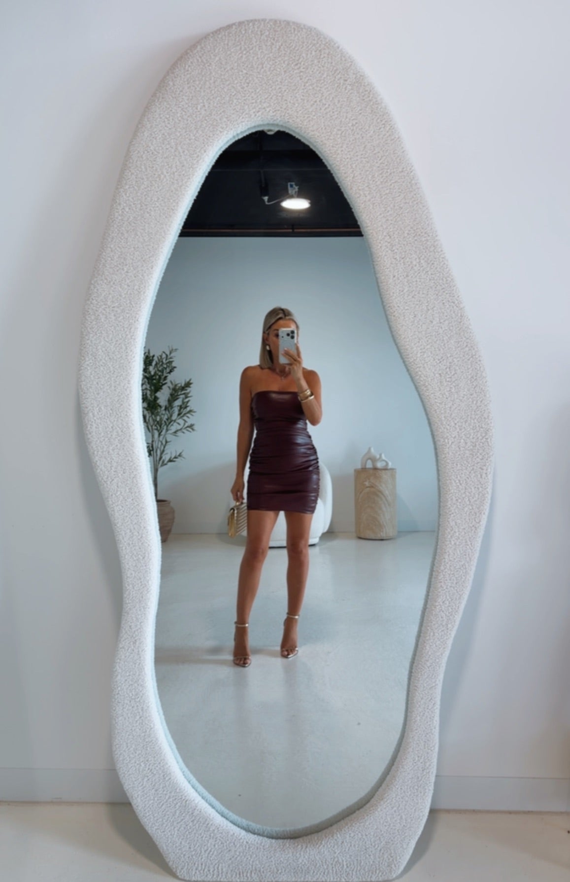 The Amari Dress is a striking mini dress in wine. It’s crafted from sleek leather material, offering a bold, contemporary look. The dress features flattering ruching details along the sides, adding texture and shaping to the silhouette, strapless design with a centre seamless zip at the back for an easy fit. Its short, mini cut emphasizes a playful, confident style, making it perfect for an evening out or special occasion. The combination of luxe leather and the ruching creates a chic and form-fitting design that exudes both elegance and edginess.
