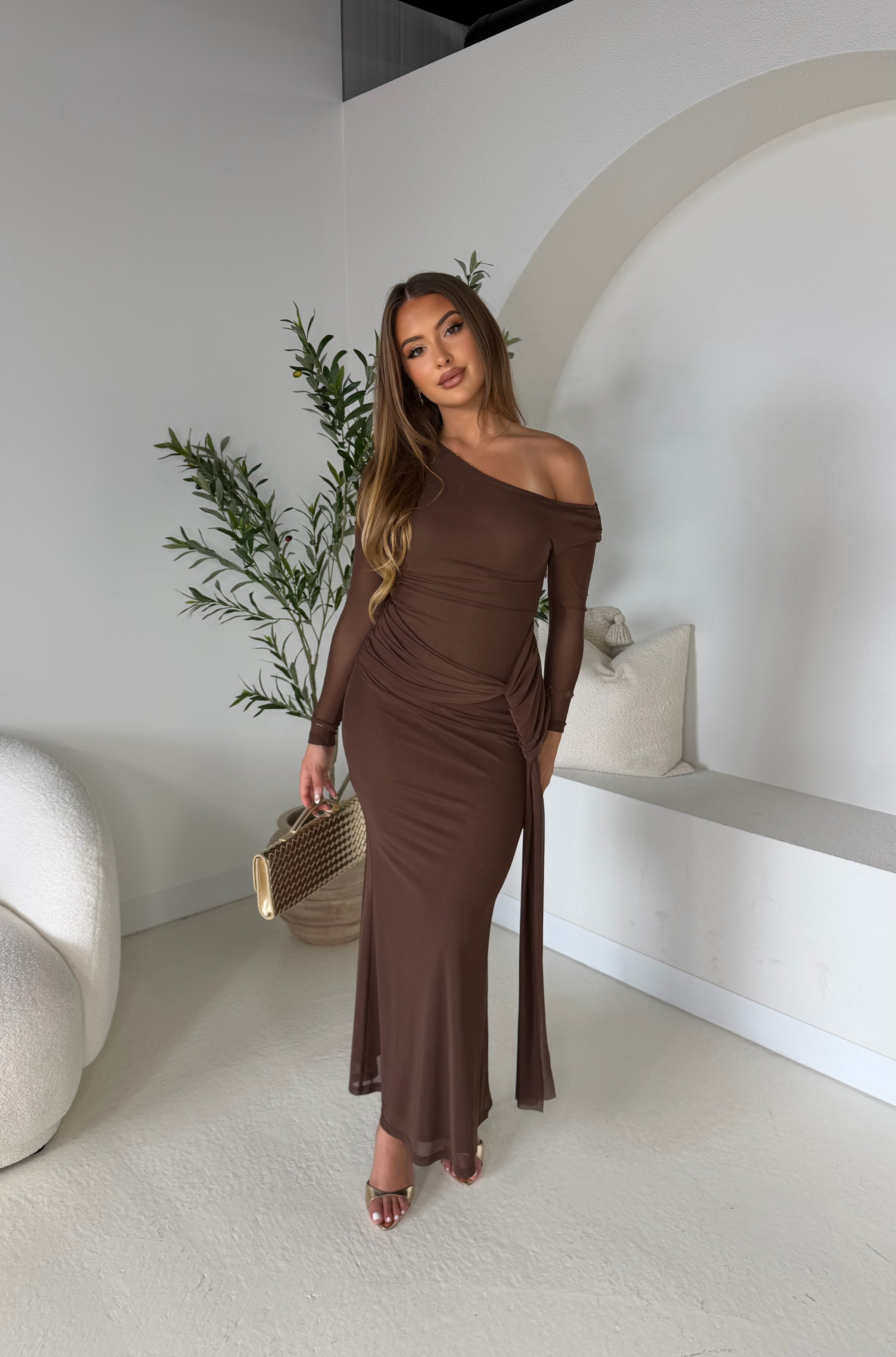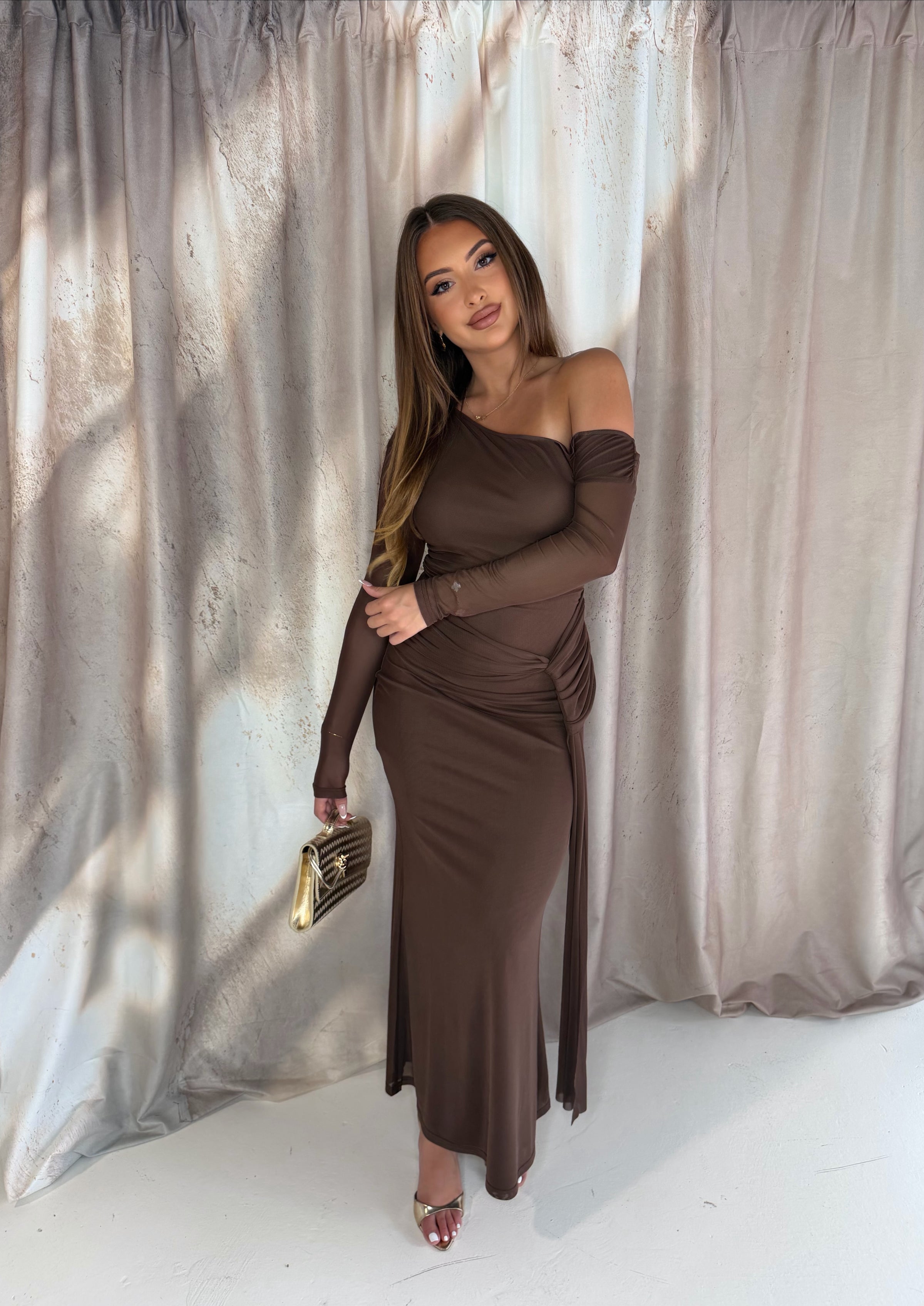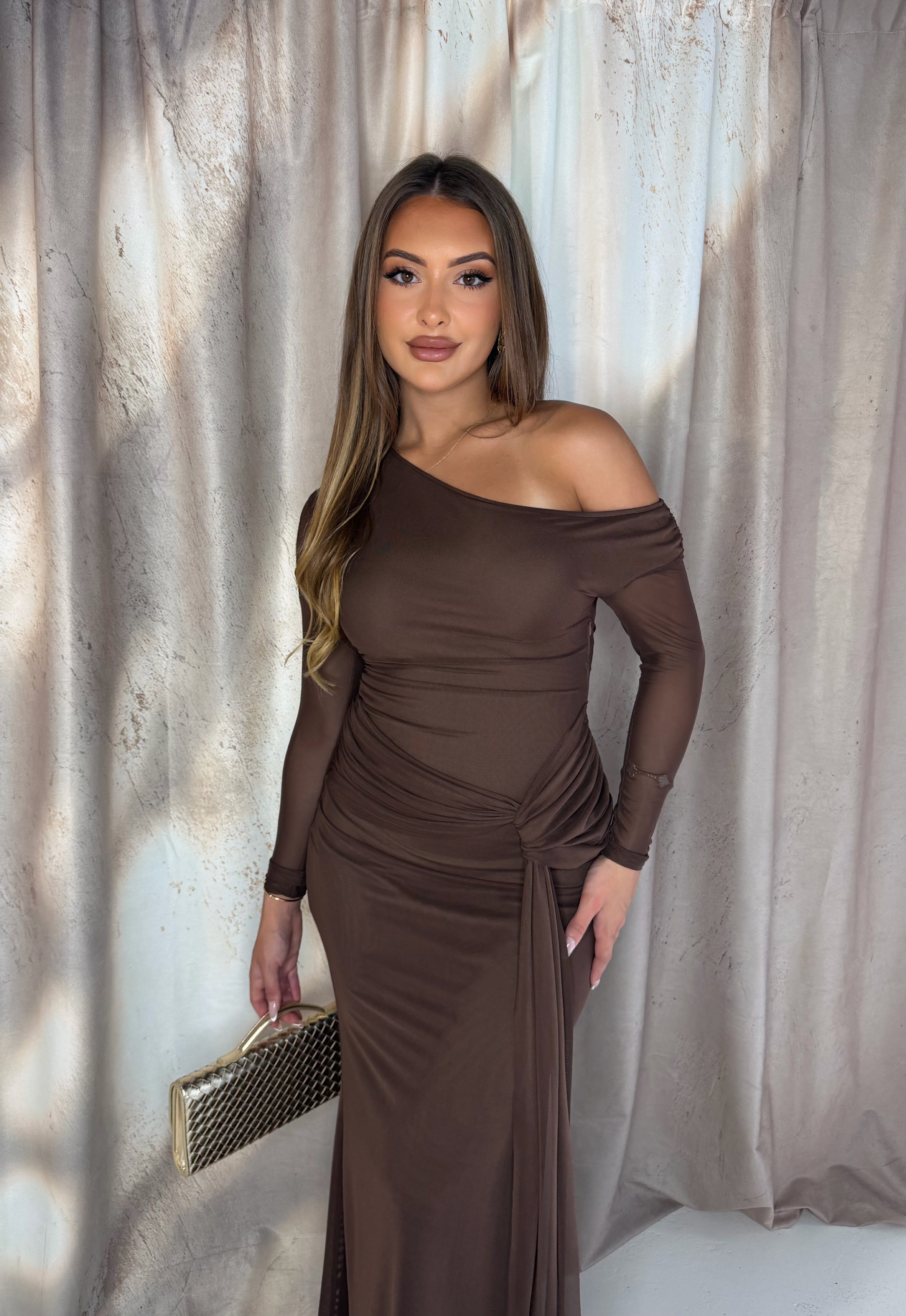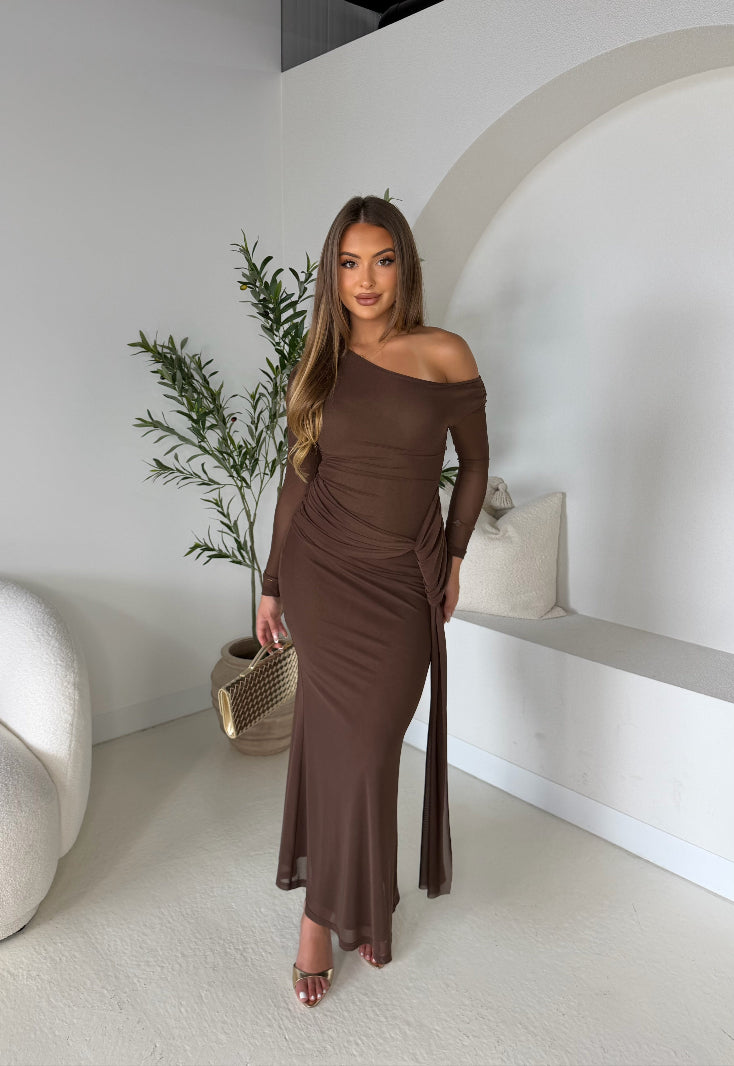 The Delilah Dress in chocolate is a stunning maxi-length dress designed to flatter the silhouette. It features beautiful ruching around the waistline, creating a flattering and elegant shape.