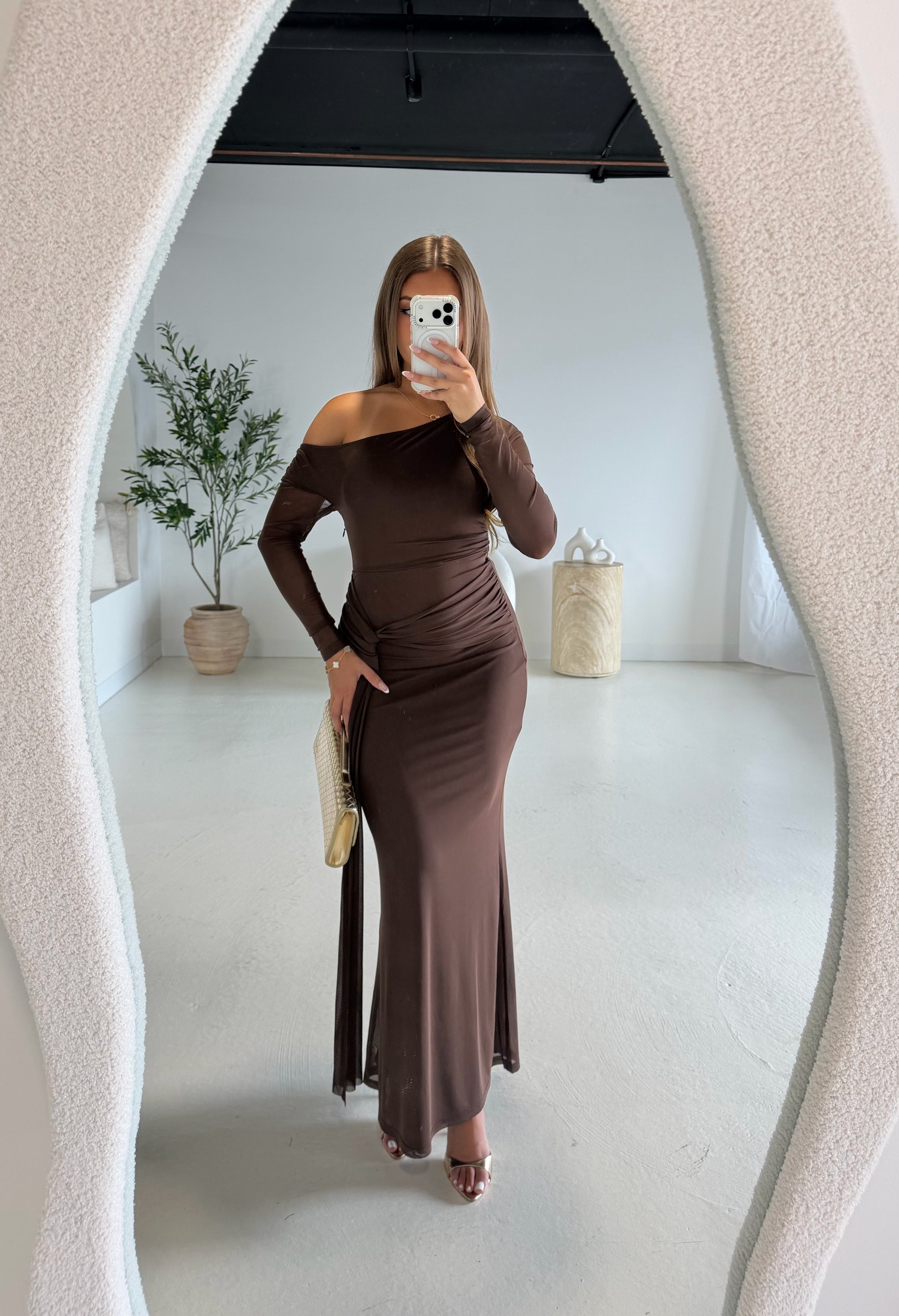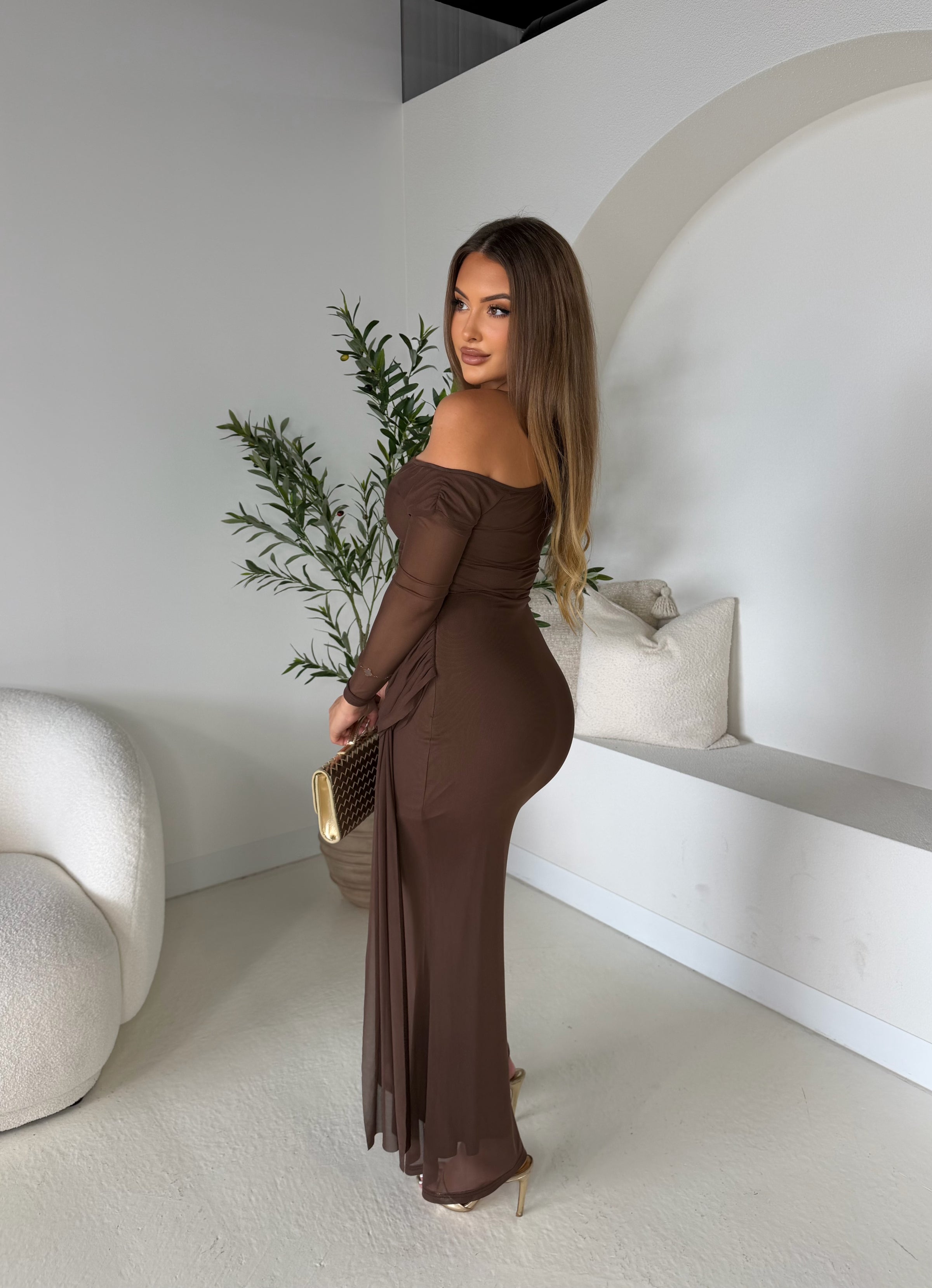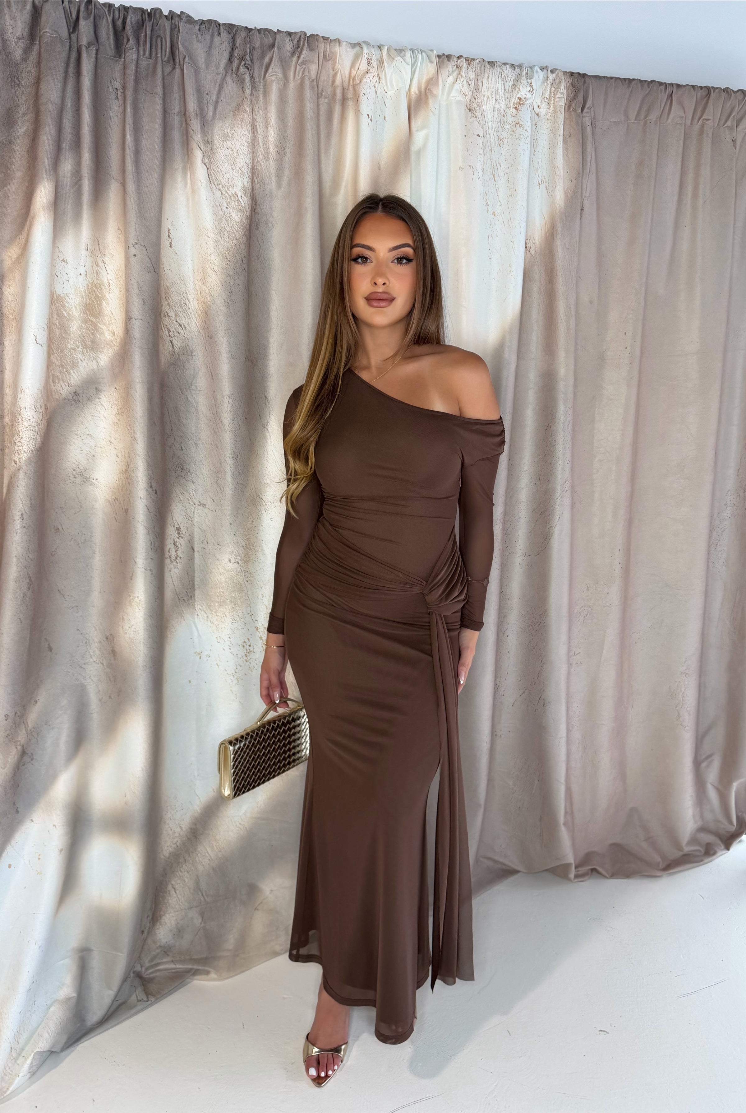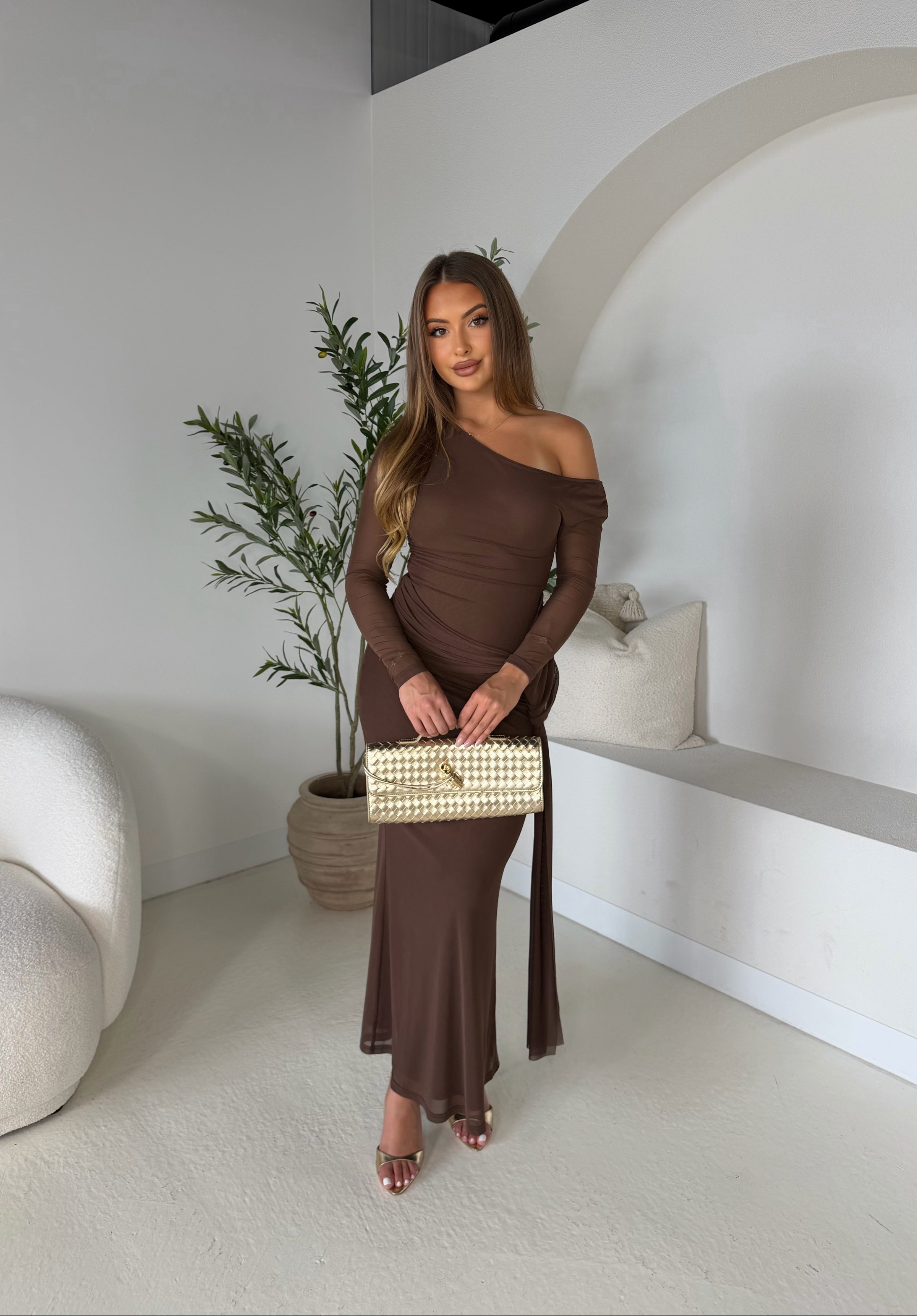 The Delilah Dress in chocolate is a stunning maxi-length dress designed to flatter the silhouette. It features beautiful ruching around the waistline, creating a flattering and elegant shape.