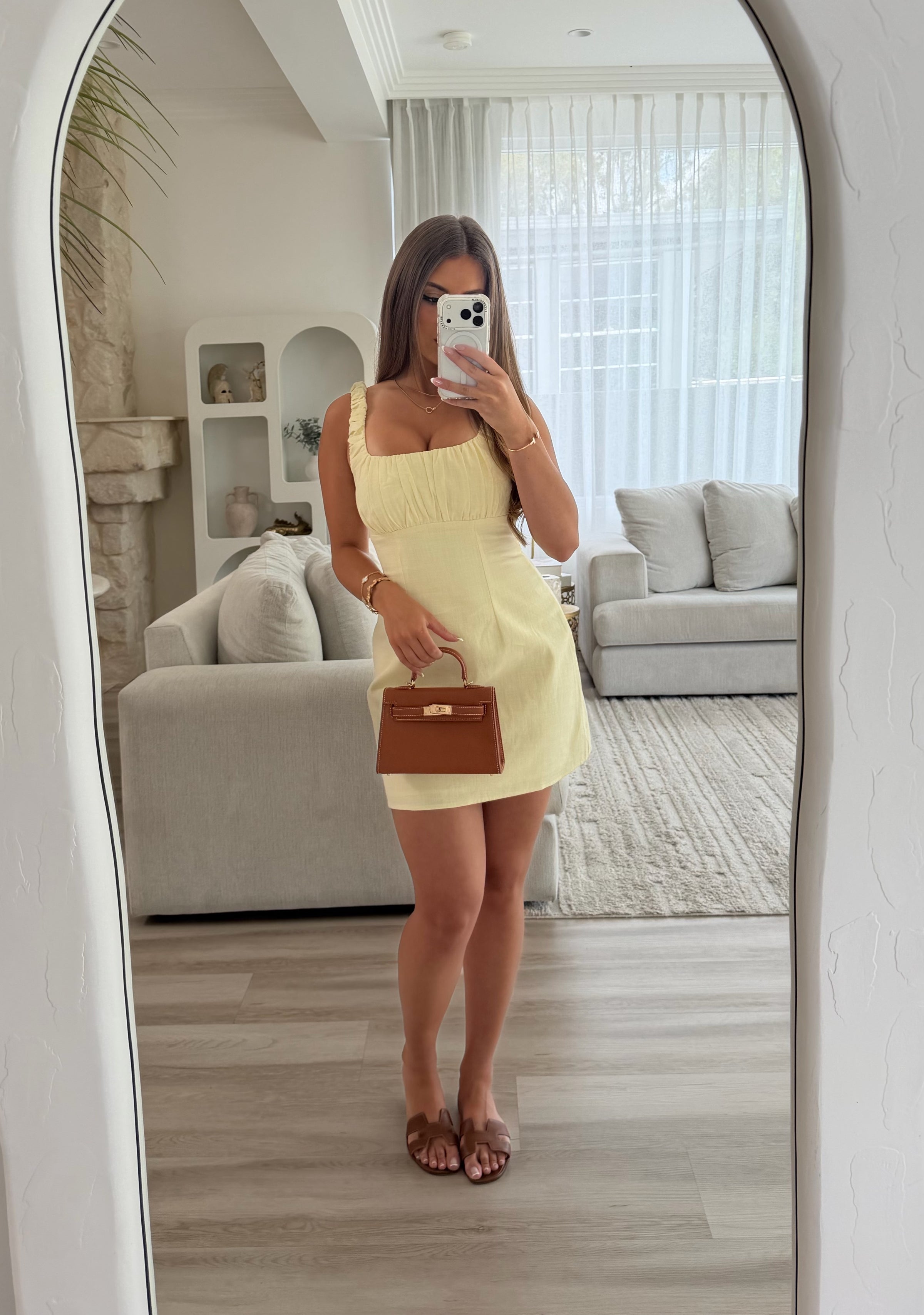 The Eleni Dress features a mini, linen-like material, silhouette designed for effortless wear. It showcases a scrunch bust neckline and straps that adds soft structure and seamless centre back zipper for easy access. This dress offers both comfort and a flattering fit perfect for warm days and elevated casual looks.