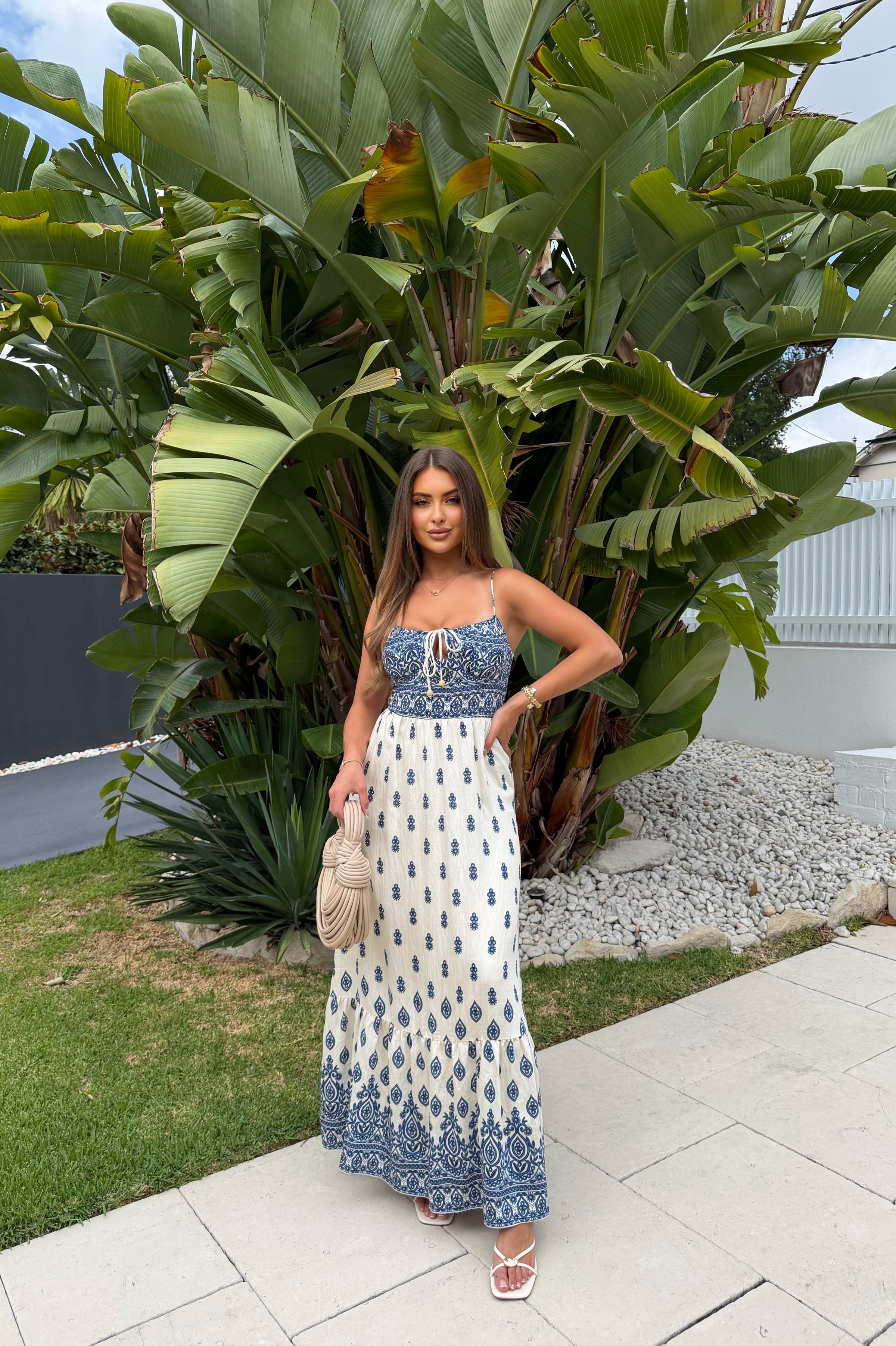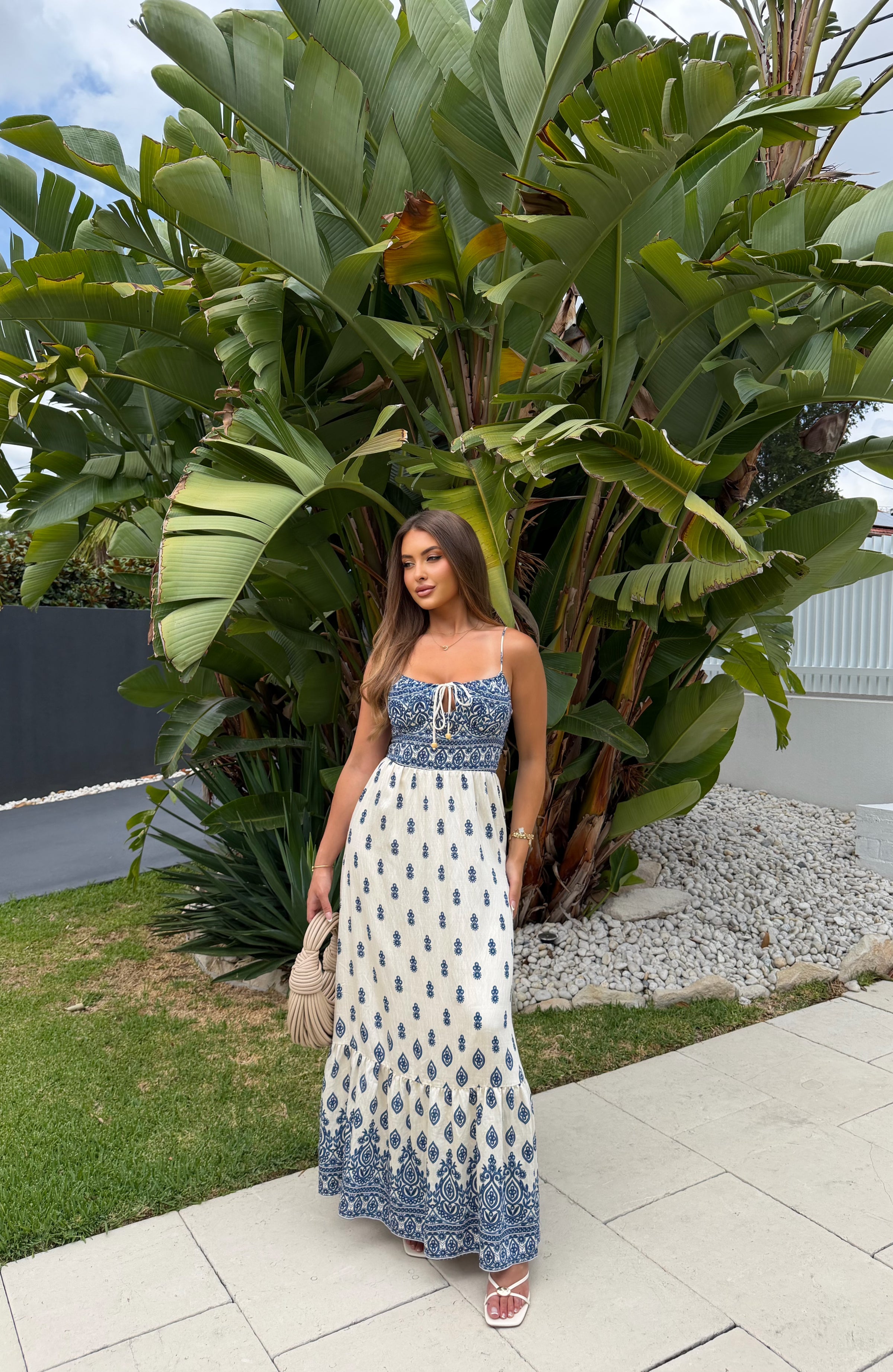 The Etta Dress Maxi is a long, elegant style designed to make a statement. Featuring a soft cream base with a blue pattern that flows upward from the hem, this dress creates a beautifully eye-catching look. It has delicate straps that are adjustable and a square neckline with a tie-up detail at the bust for a flattering finish. Designed with a back zipper for easy access and an elasticated back for added stretch and comfort, the Etta Dress Maxi is perfect for special occasions or elevated everyday wear.