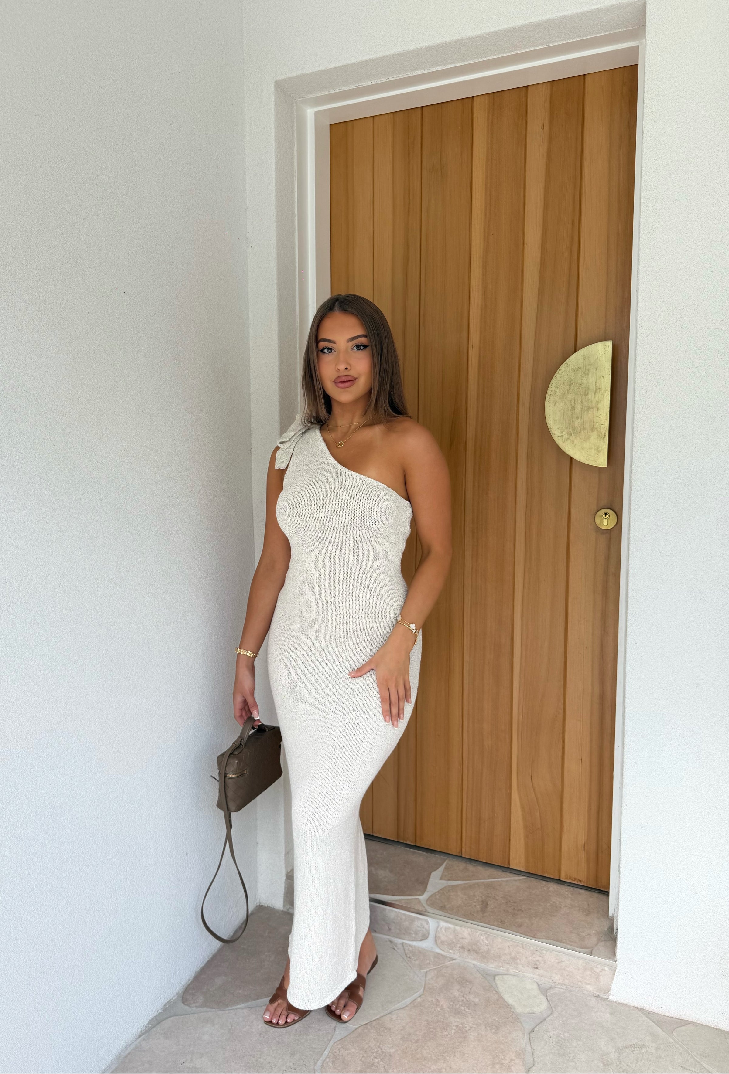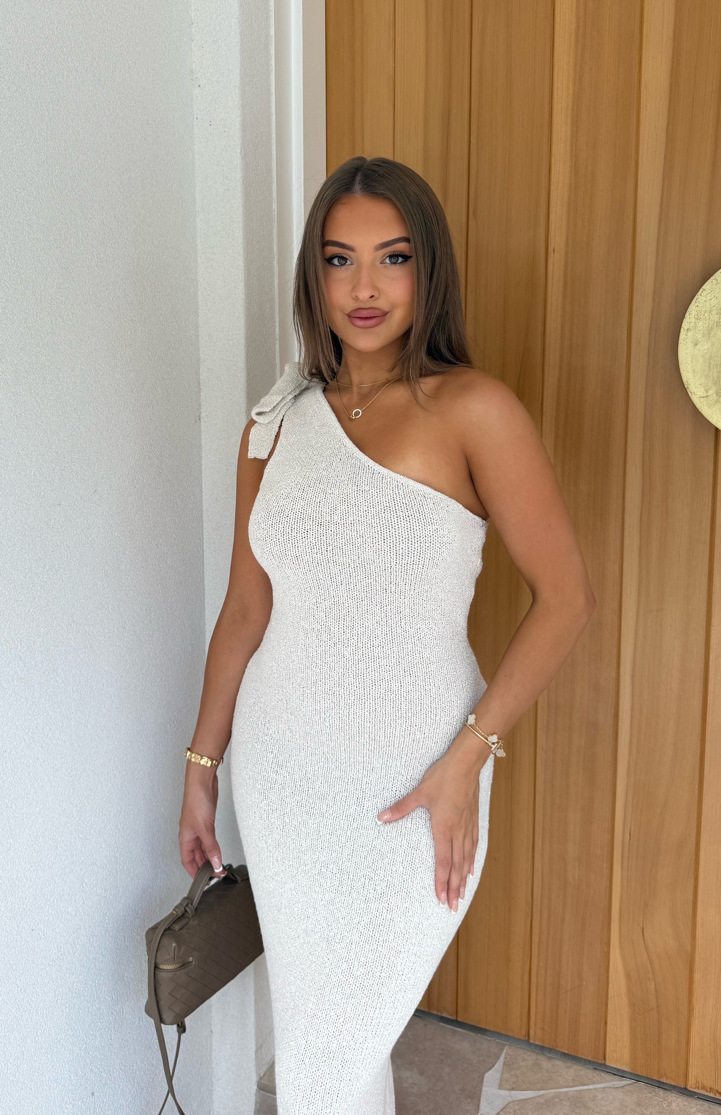 Elevate your look with the Ezra Dress in Sand, a timeless maxi designed to flatter in every way. Crafted from a crochet, stretch fabric, this dress offers both comfort and a sculpting fit that hugs your figure beautifully. The one-shoulder design features a statement tie-bow detail, adding a soft, elegant touch to its modern silhouette.