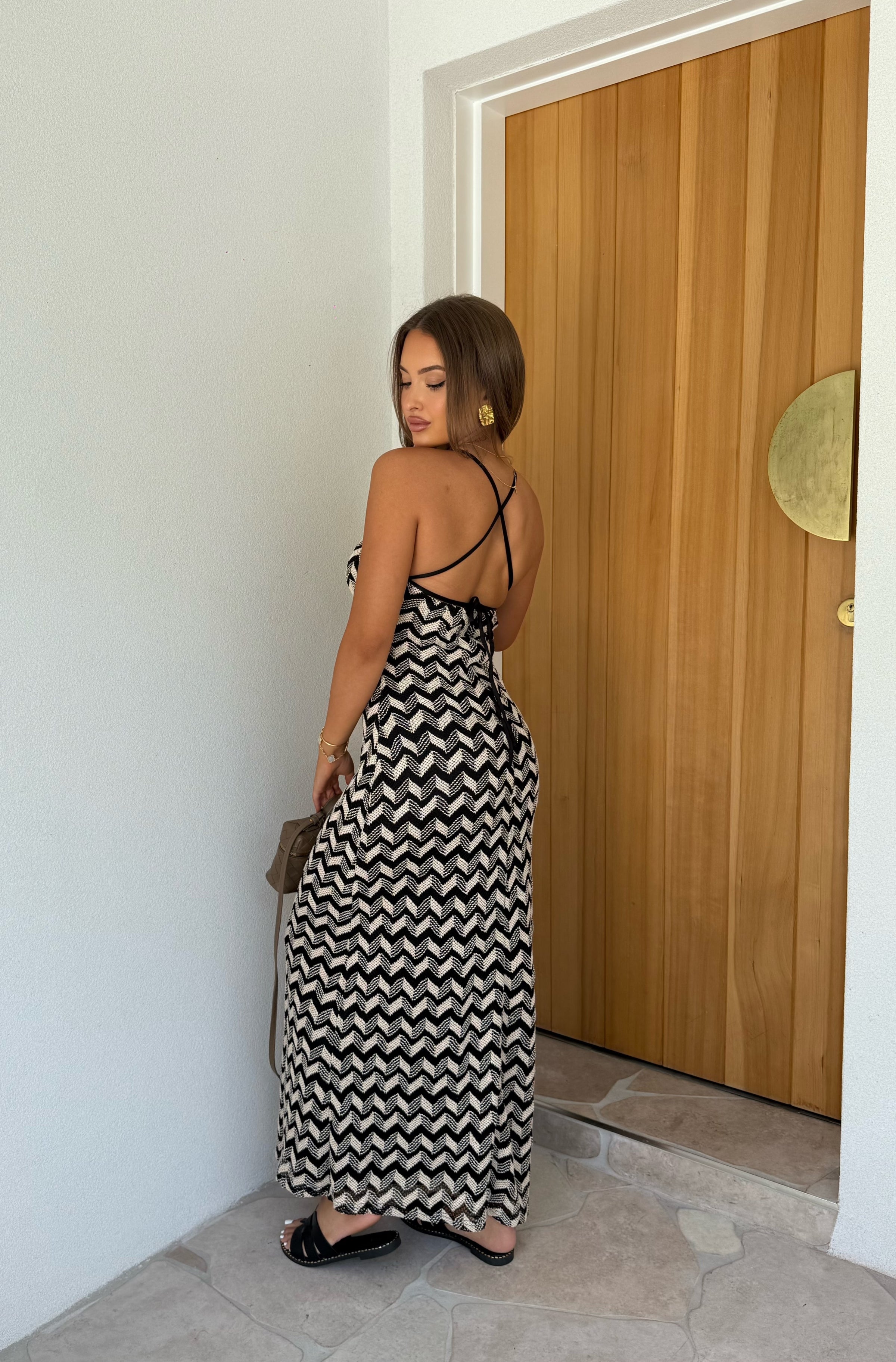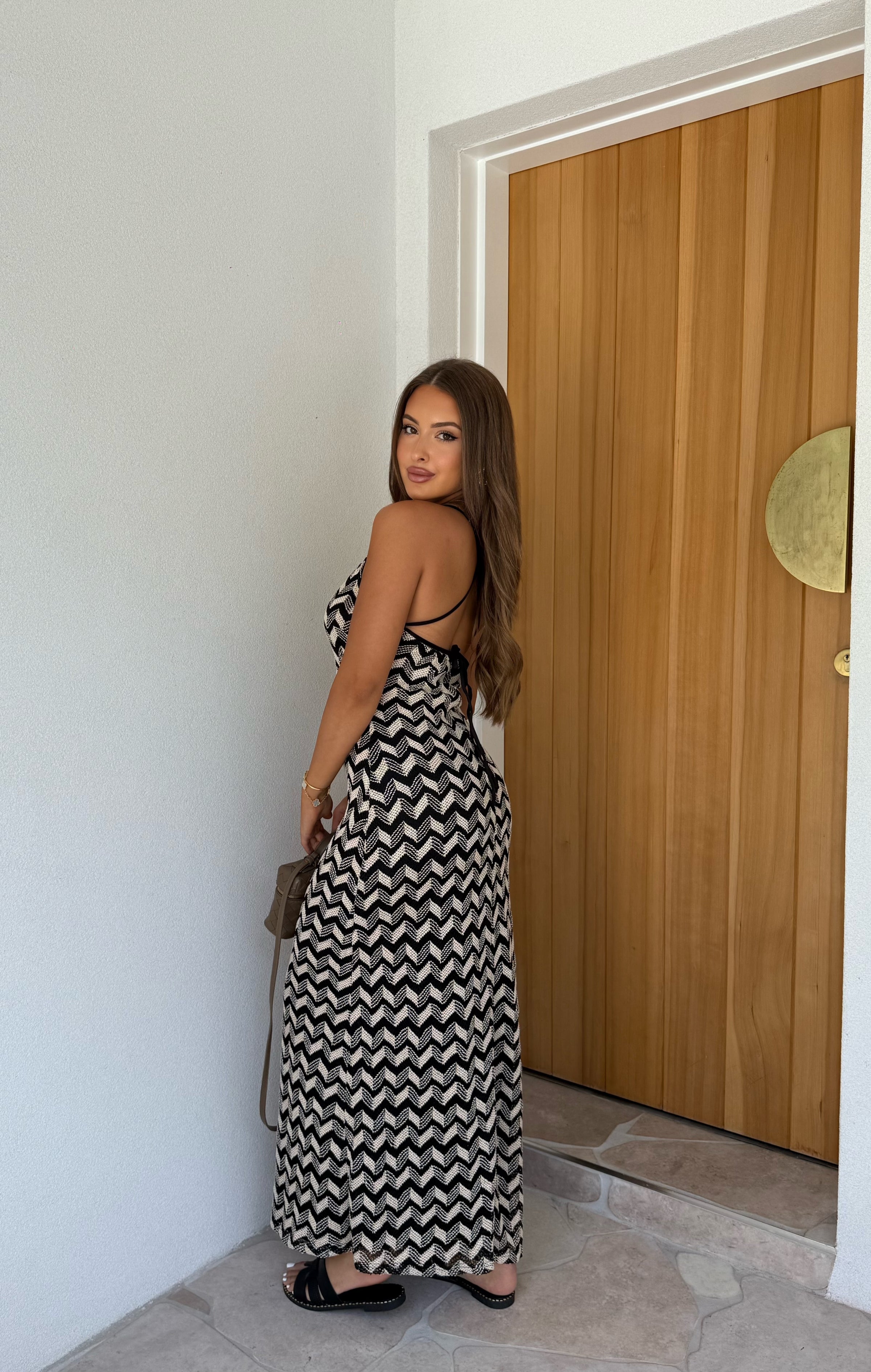 Our Gabbana Maxi Dress is a designer-inspired maxi dress in timeless black and beige crochet. Featuring a halter tie-up neckline, this stunning piece blends elegance with effortless beachside charm. Lightweight and eye-catching, the Gabbana Dress is perfect for seaside escapes, summer parties, or layering over swimwear for a luxe resort look.