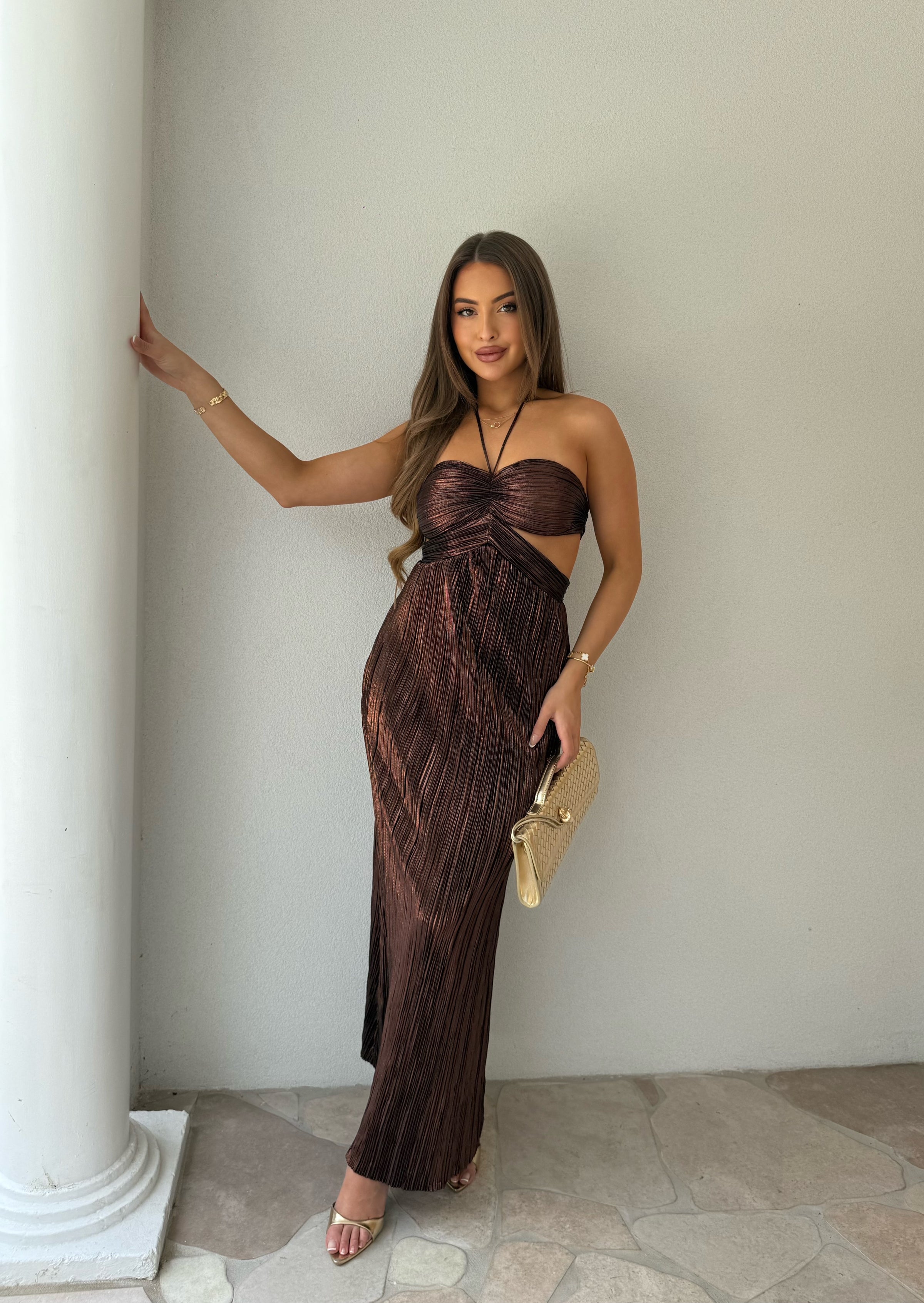 Our Luna Pleated Dress in bronze is a true statement piece. Crafted from fully pleated, shimmering bronze fabric, it features a halter tie neckline, waist cut-out details, and an open-back design. Absolutely stunning for any special occasion.