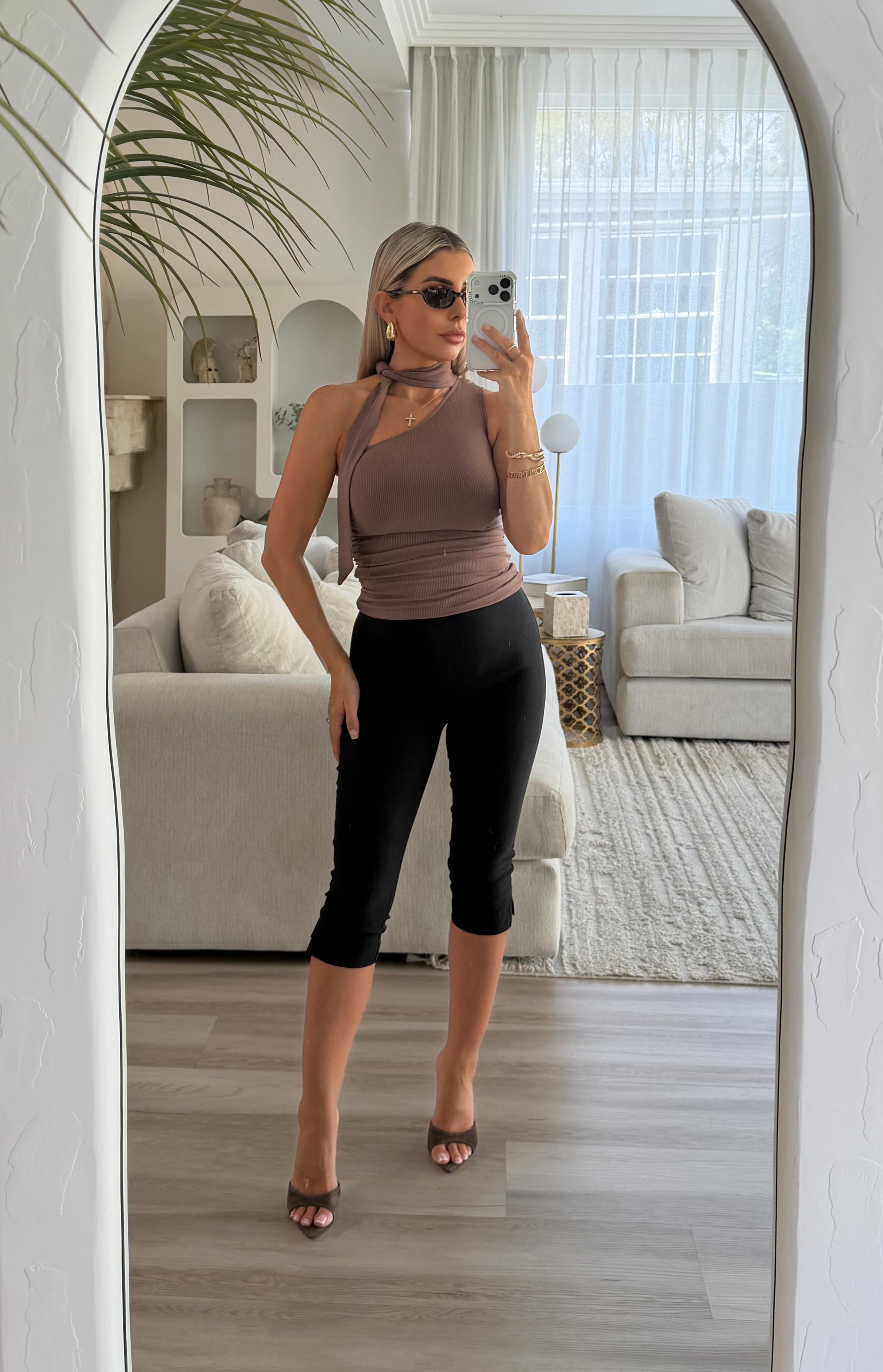 Our Melani Top in mocha is the perfect elevated piece for the season. Featuring a chic one-shoulder silhouette with a tie-neck detail and flattering side ruching on each side, this top is crafted from our signature stretch ribbed fabric for a sculpted, comfortable fit.