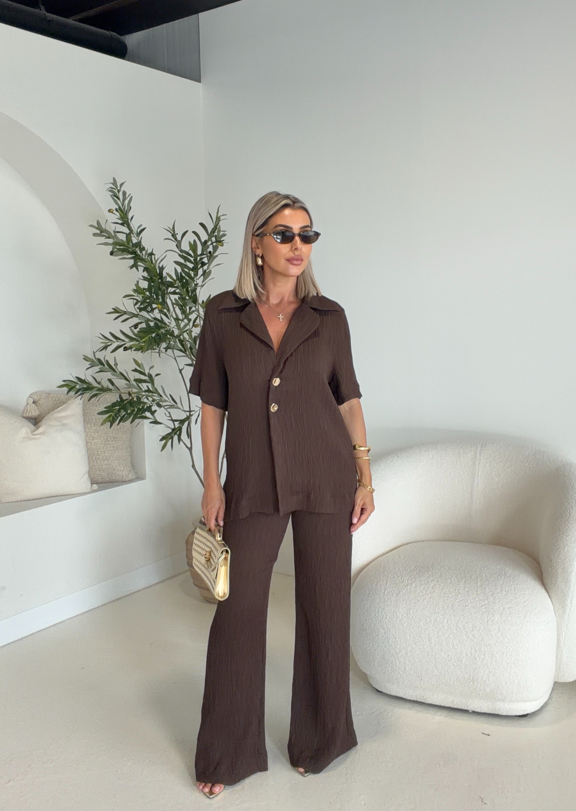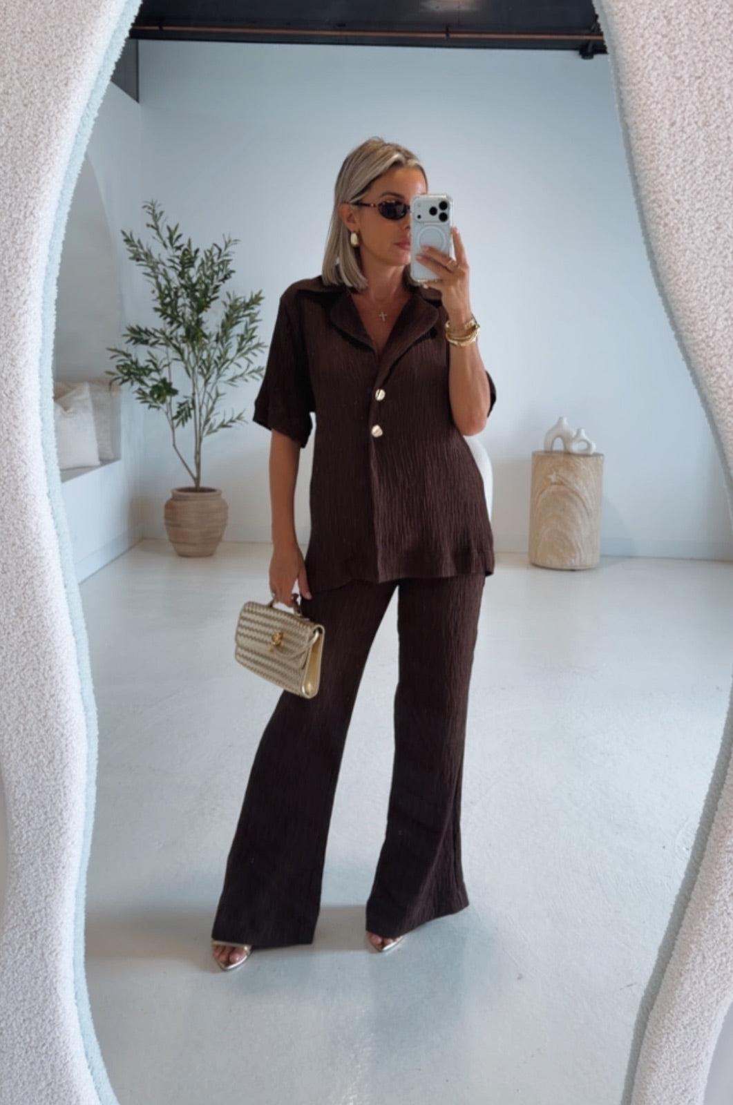 The Pandora Set is a rich espresso-toned, textured two-piece designed for effortless sophistication. The top features a structured collared neckline, short sleeves, and elegant gold button detailing for a refined finish. Perfectly paired with matching pants, the set offers a high-waisted fit with a comfortable elastic waistband, side pockets and a flattering wide-leg cut. Equal parts elevated and wearable, the Pandora Set transitions seamlessly from day to night with ease.