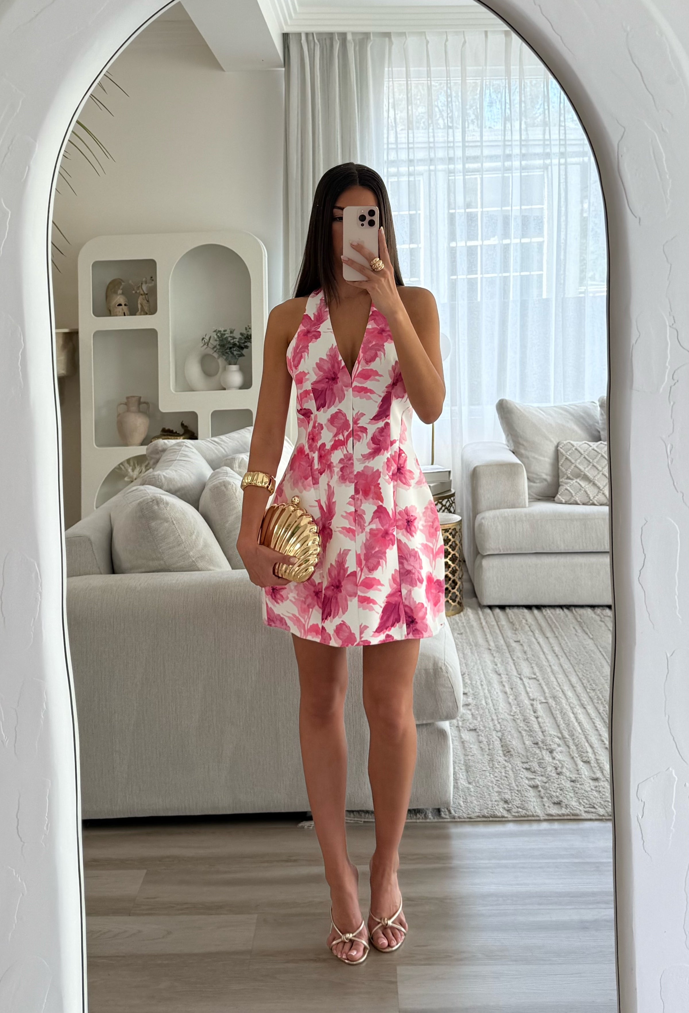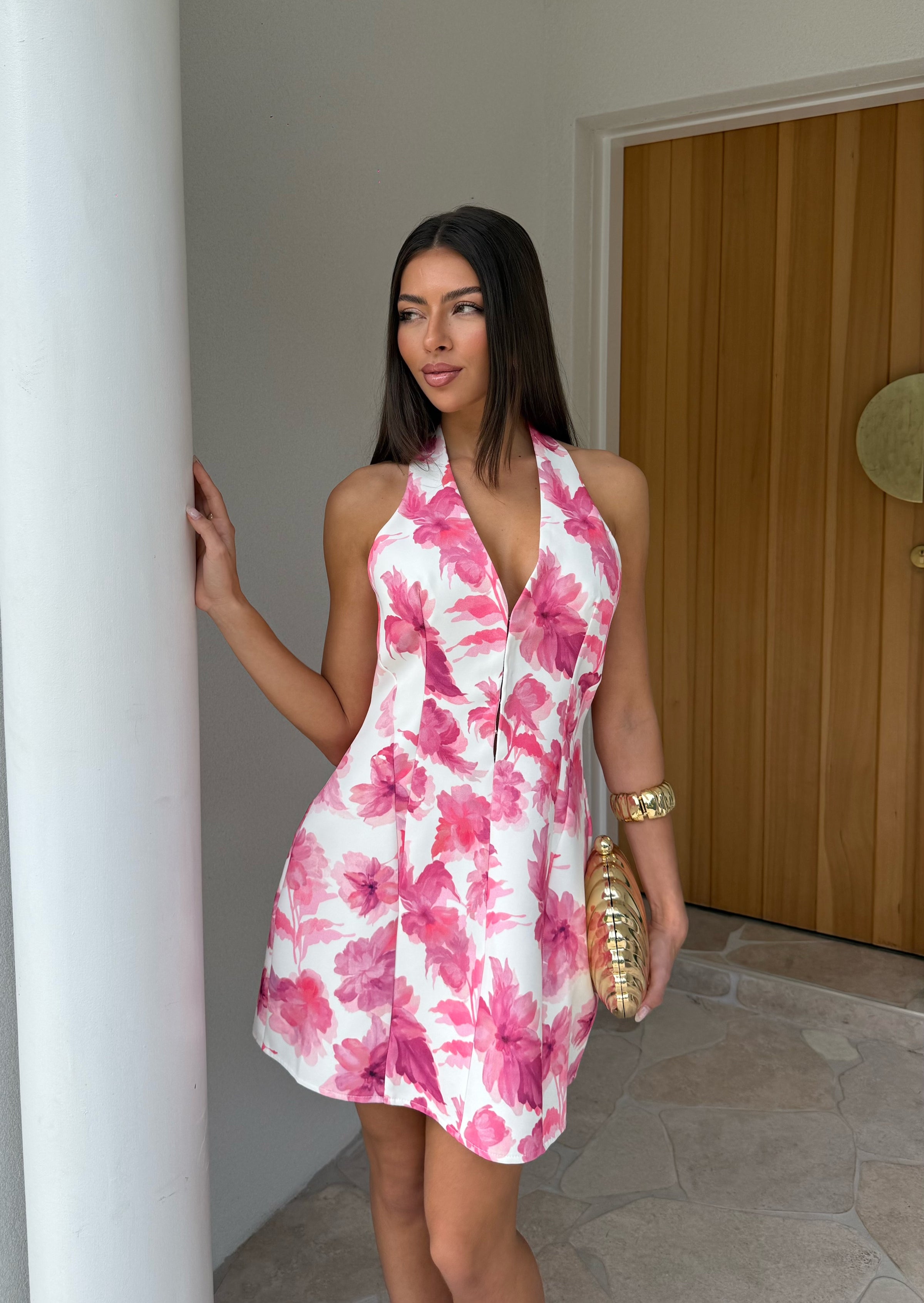 Our Pixie Dress features a stunning suit silhouette fabric with a chic halter neckline and hook closures down front centre. it features a zipper located on the back for secure fit. Its our best selling style and now in a pink and white floral pattern. Perfect for this season and spring races.