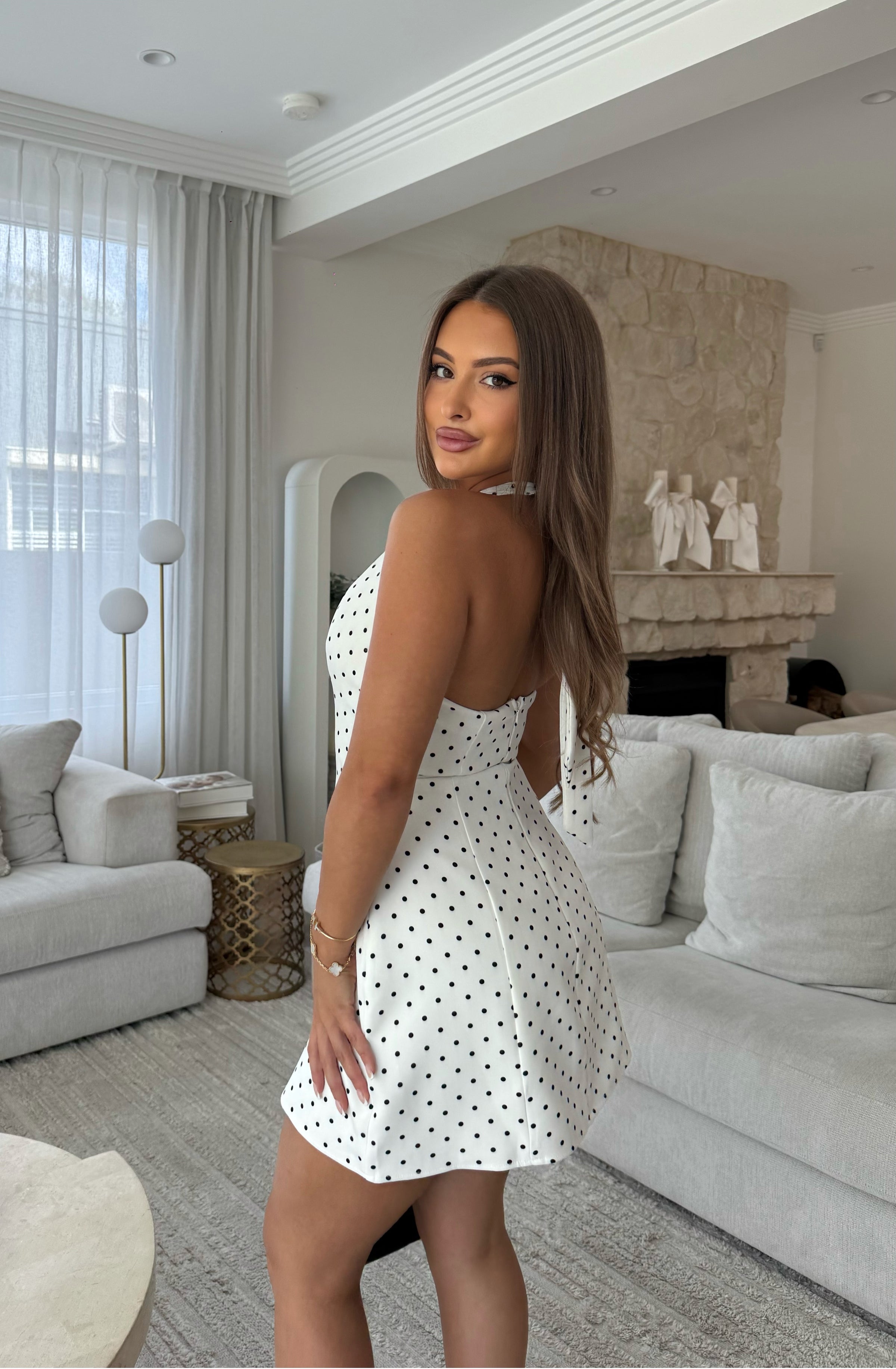 Our Pixie Dress features a stunning suit silhouette fabric with a chic halter neckline and hook closures down front centre. it features a zipper located on the back for secure fit. Its our best selling style and now in a black and white Poka dot pattern.  Perfect for this season and spring races.