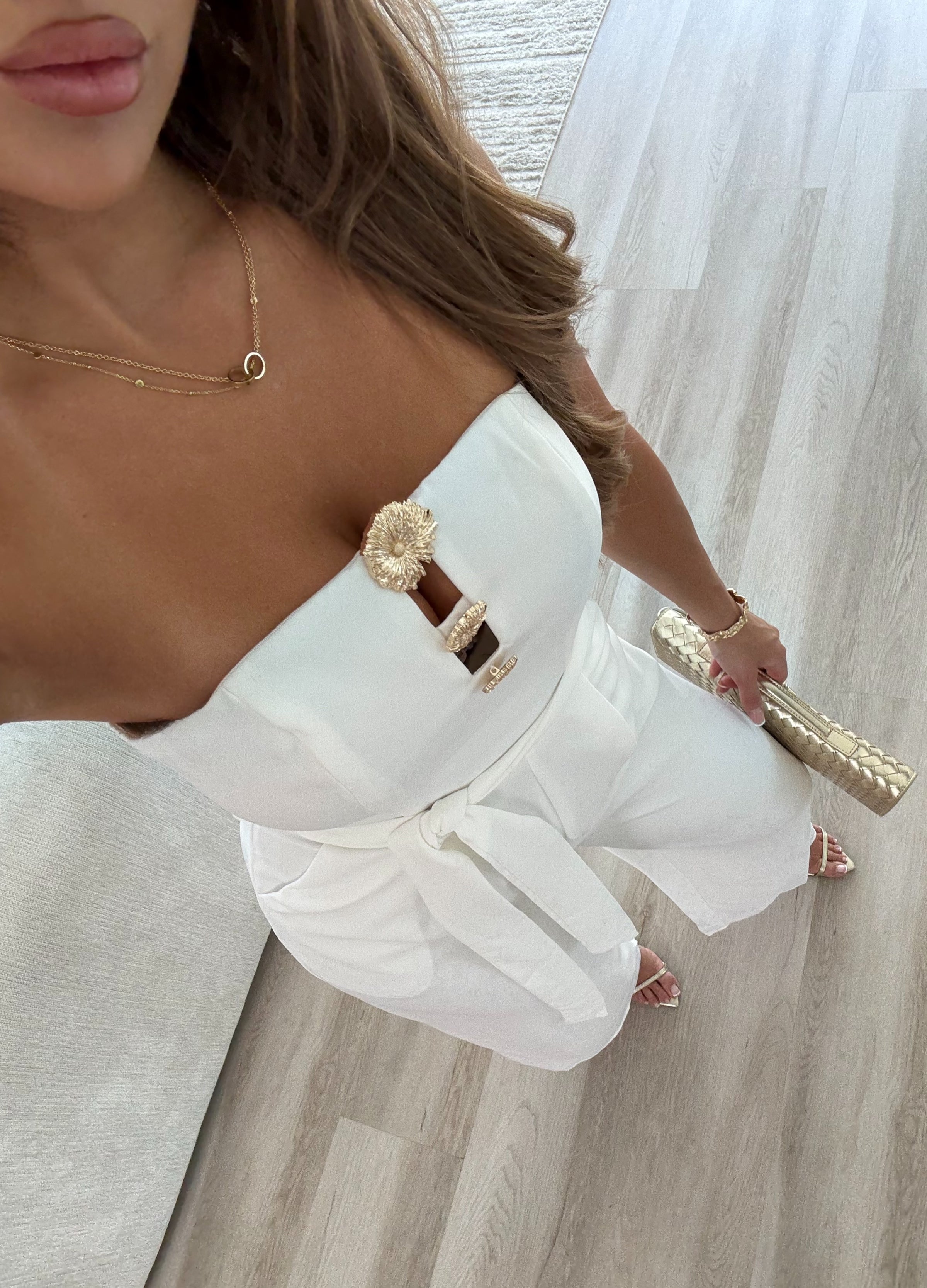 Meet the Stella Jumpsuit a blend of sophistication and chic design. This strapless jumpsuit features a fitted bust area, seamless centre zip at the back, detachable tie around the waist, wide-leg cut, side pockets, gold flower hardware feature between bust area and is fully lined. The Stella Jumpsuit is the epitome of effortless elegance for any occasion.