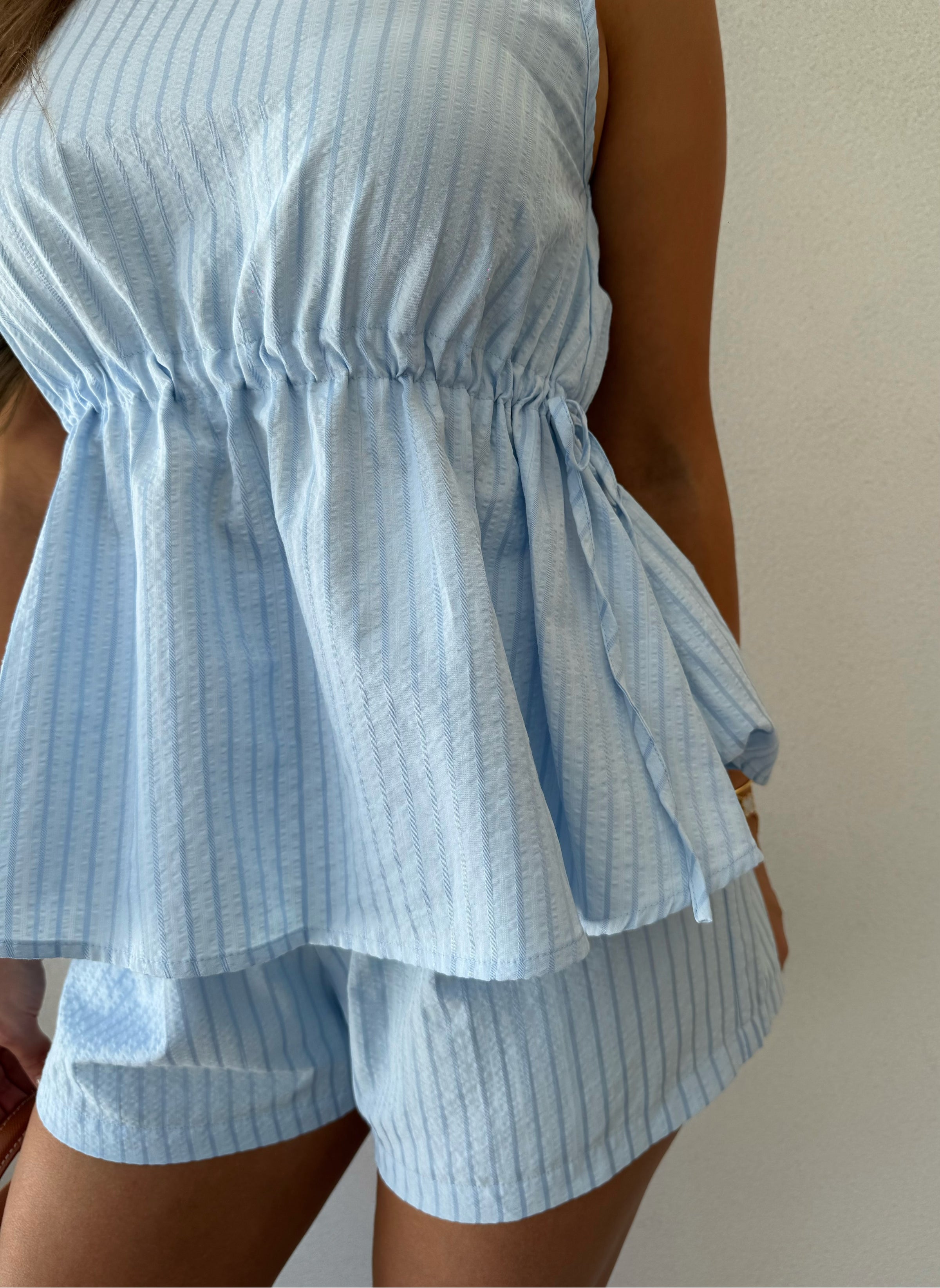 The Ebony Set is your effortless everyday go-to, designed to be worn together or styled separately for endless outfit options. Featuring a high-neck top with an adjustable drawstring waist for a flattering fit, paired with high-waisted shorts with a drawstring and full lining for comfort and ease. Crafted from a breathable blend of 70% polyester and 30% cotton, the subtle pinstripe print adds a refined touch to this relaxed yet elevated look. The perfect set for chic, off-duty days.
