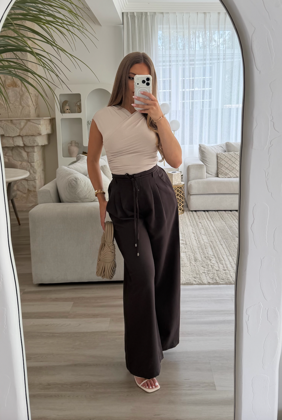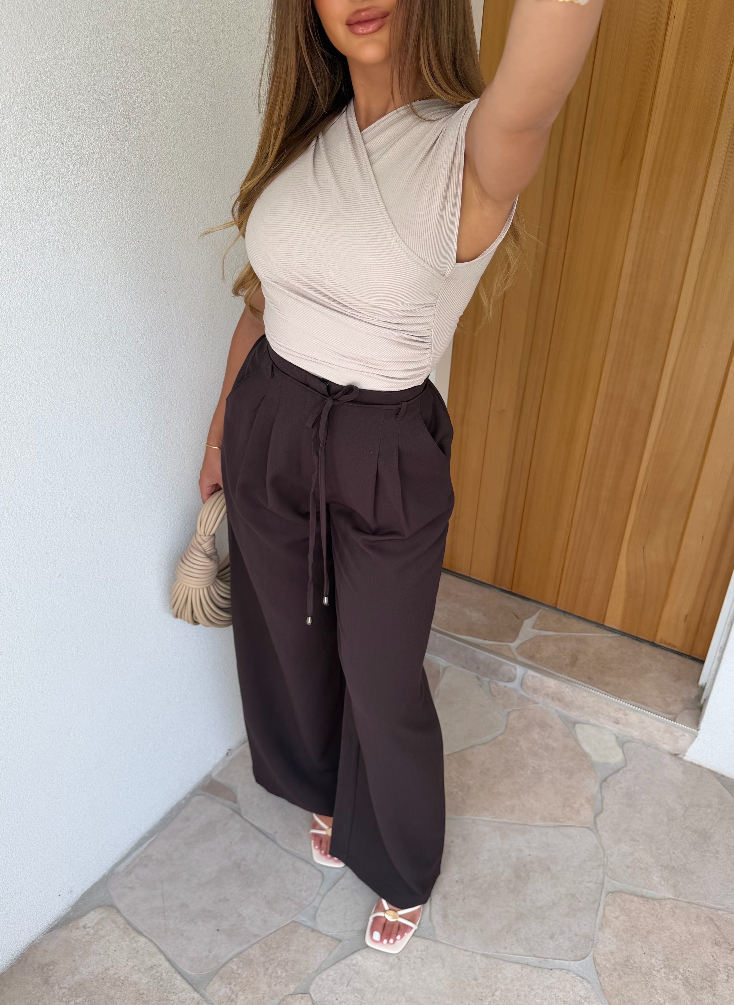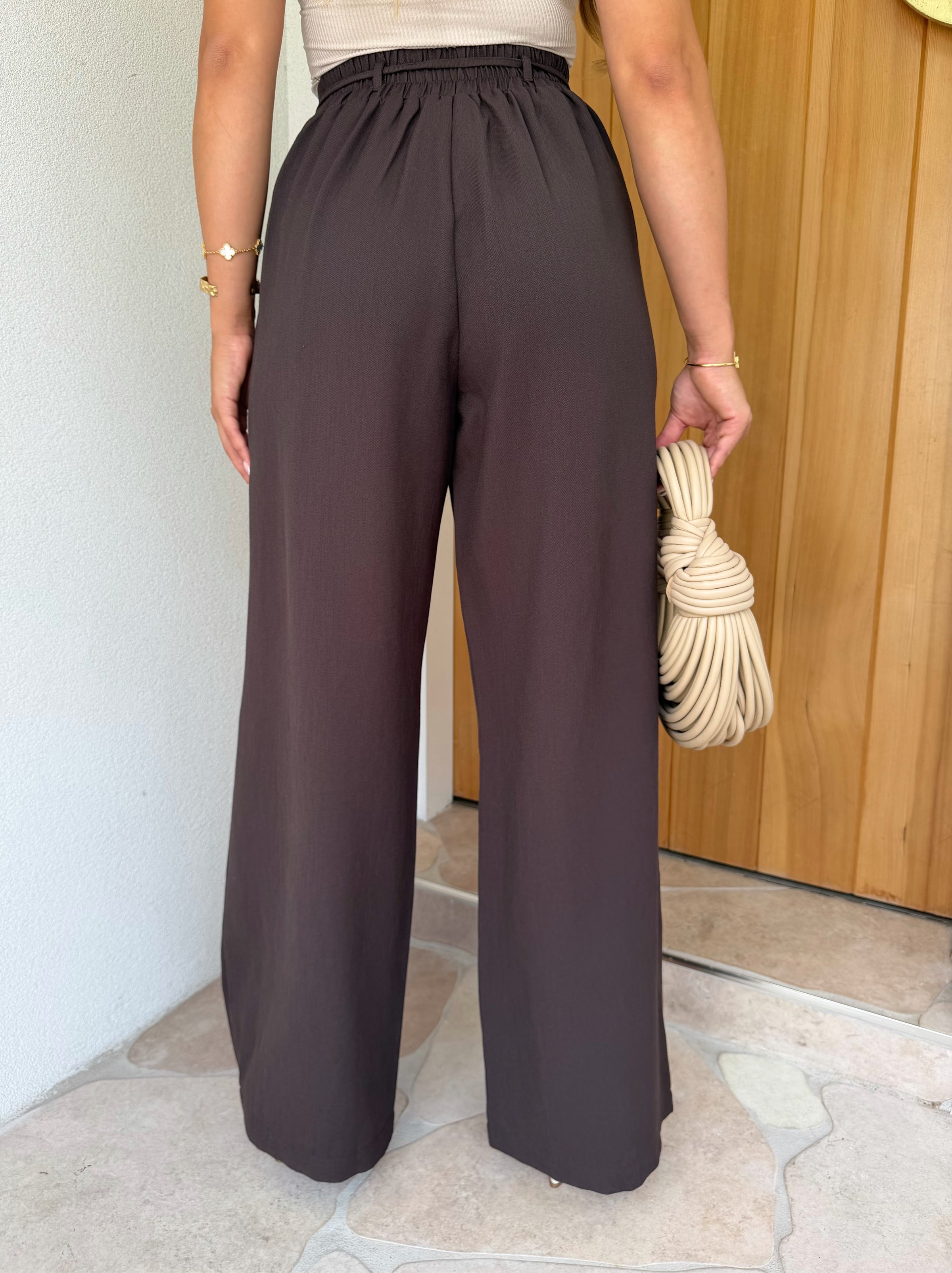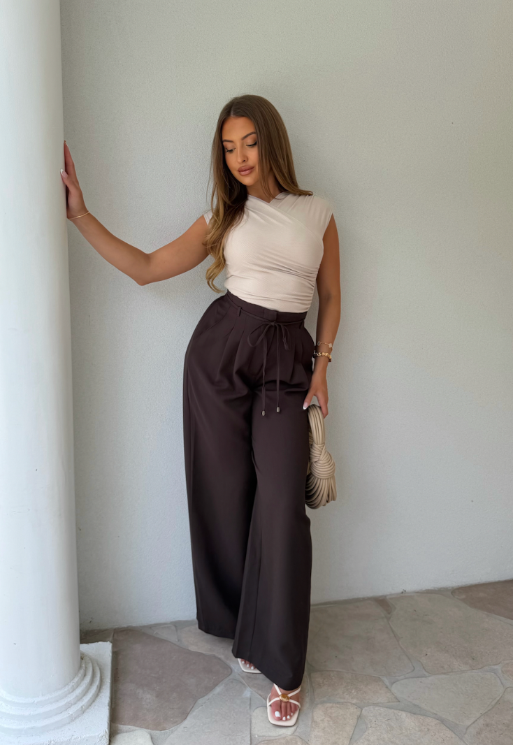 Crafted in a rich, deep cocoa hue, these statement pants are designed to flatter and elevate your everyday style. Featuring a high-waisted cut with an invisible zip and secure button closure at the waist, they offer a smooth and tailored finish from the front.